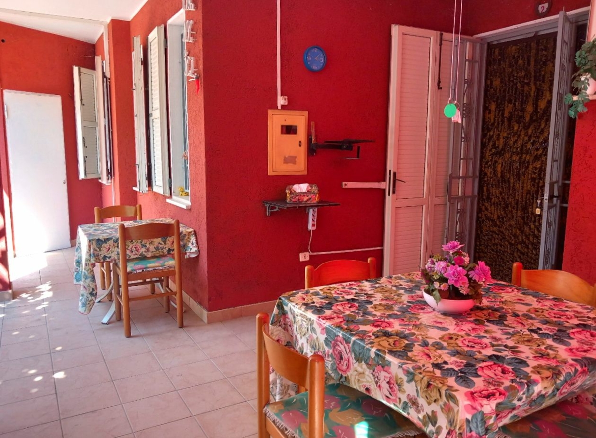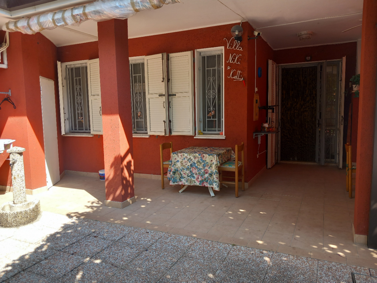 DESCRIZIONE IMMOBILE: All'immobile si accede da un cancello carraio, da cui si entra all'interno di un ampio giardino piastrellato e parzialmente piantumato. Attraversando uno spazioso portico, dotato di ripostiglio e camino in muratura, si entra direttamente nel soggiorno con angolo cottura a vista, da un piccolo disimpegno si passa poi al bagno accessoriato con box doccia, alla camera da letto matrimonile e alla cameretta.